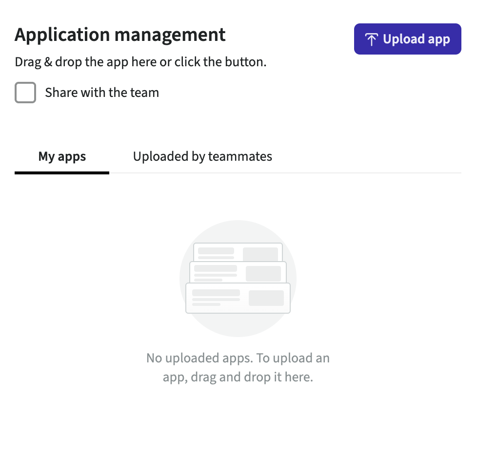 To upload an application file, you need to choose an option depending on whether the Application management tab is empty or has applications: