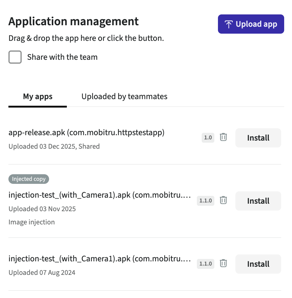You can manage your applications in the Application management tab: upload, install, uninstall, remove. You can find the tab for every device in the session in the Pane.