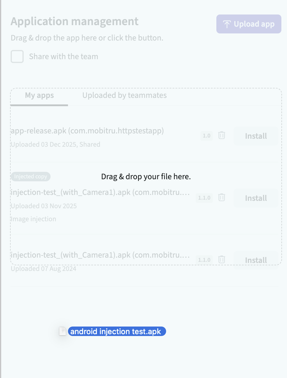 - Upload app button – opens folders of your computer to choose an application file