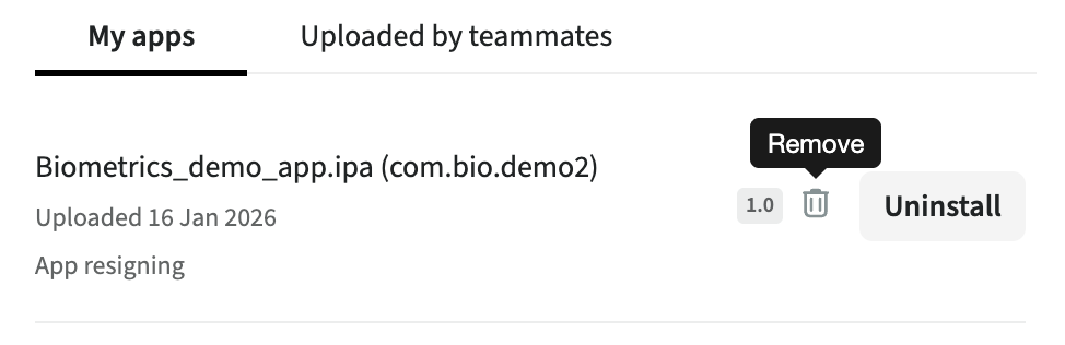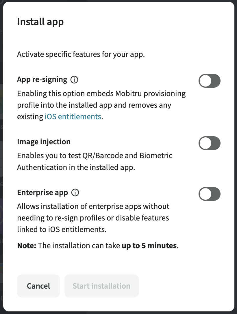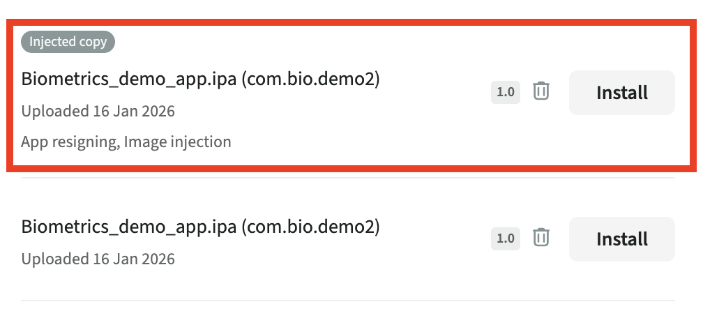 When you use the Image injection toggle for an app installation, a copy of the application will appear in the Application management tab. This copy has already been re-signed and injected with the library that allows QR/Barcode scanning and Biometric authentication. That is why, the injected copy is installed much quicker.